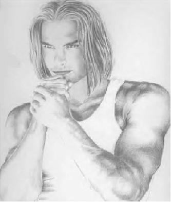 A blood rose with a black flower behind it, and blue barbwire wrapping around them both could be found on his right shoulder.